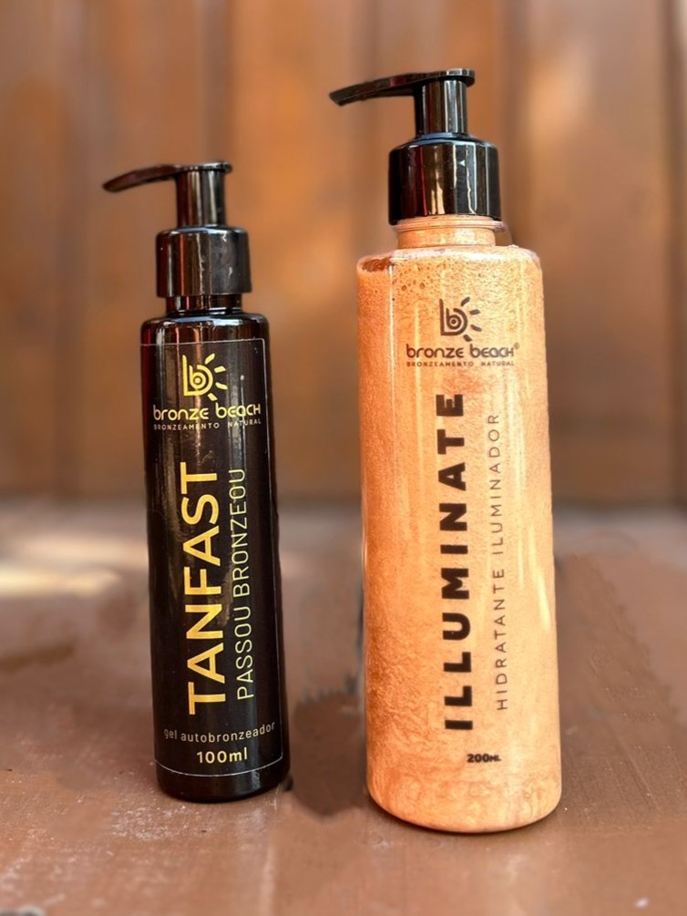 O gel autobronzeador proporciona o tom de pele dourado e o hidratante iluminador, além de hidratar a pele, deixa o efeito cintilante.